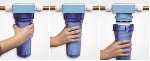 Easy cartridge change by Rainfresh. Simply grab the sump by hand, turn 1/8 turn and remove cartridge. Rainfresh easy cartridge change is a first in the industry.
